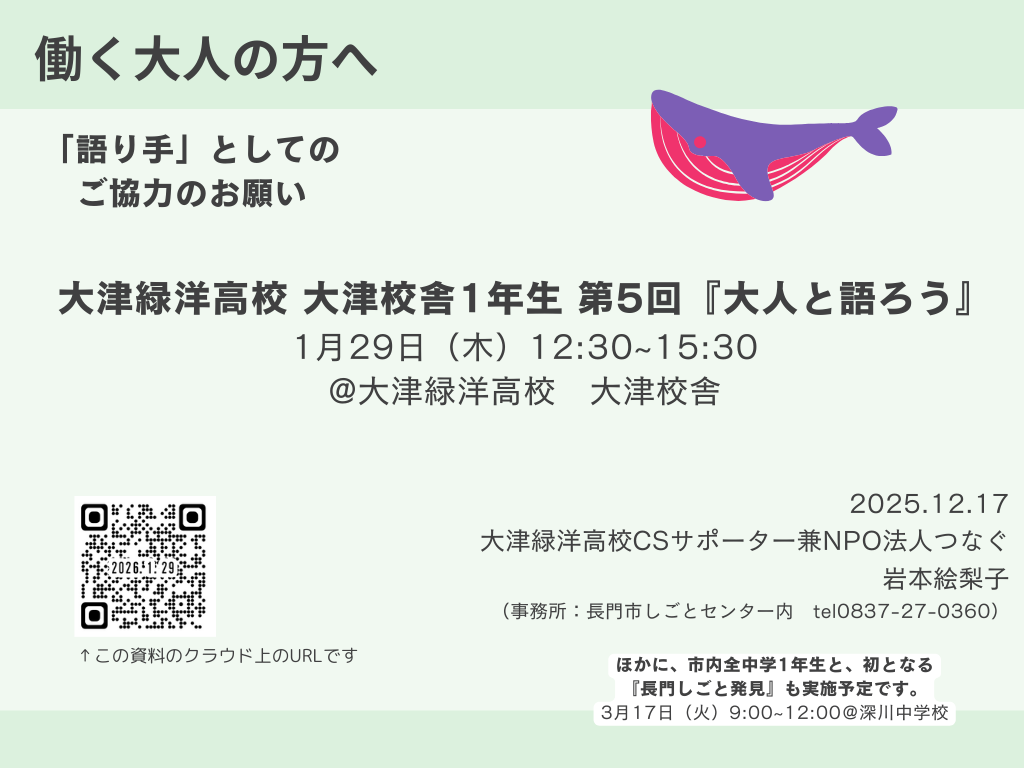 こんにちは!長門市しごとセンター(NPO法人つなぐ)です。 2026年3月10日(火)に開催予定の『合同企業ガイダンスin長門』について、参加いただく企業・団体を募集します。(メ切1月14日正午、参加企業への事前説明会1 […]