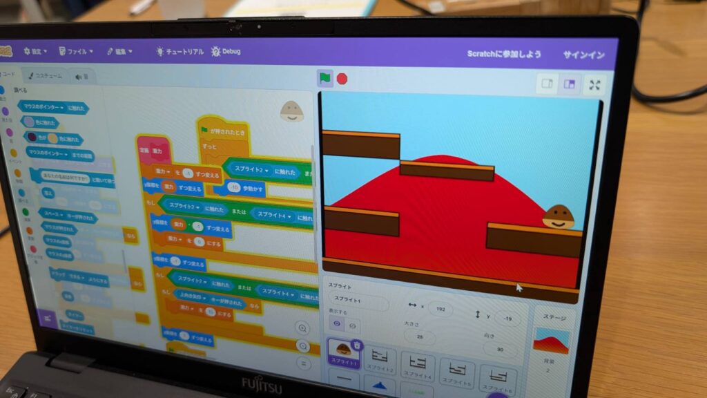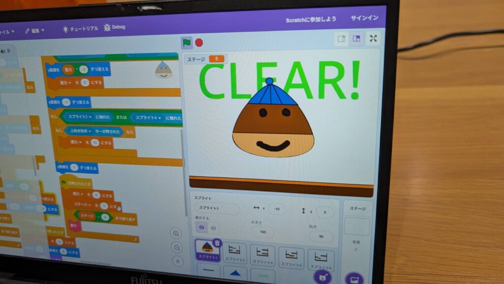 作成した「くり」を操作し上にジャンプさせて登りゴールすると、くりから手が伸びて「帽子」を被るというゲームを作成