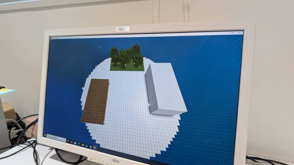 マイクラで「海」の上に島を作成し、「梨園」とお家そして「あかちゃん」が飲むミルクをつくる乳牛を育てる牛舎を作成したそうです。