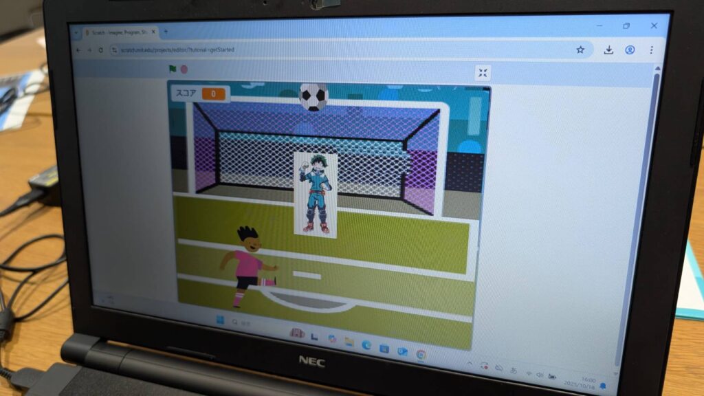 scratchでフィールドを「学校」にして「スポーツ」をサッカーにし、そのキーパーを「ヒロアカ」の主人公にとのこと