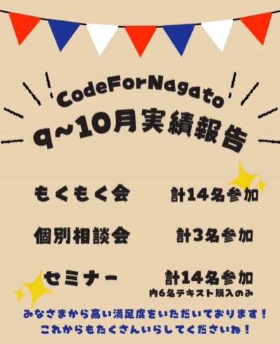 内容: Code for Nagatoの受講生が、これまでの学習や活動で「できたこと!」を共有するライトニングトークイベントです。
