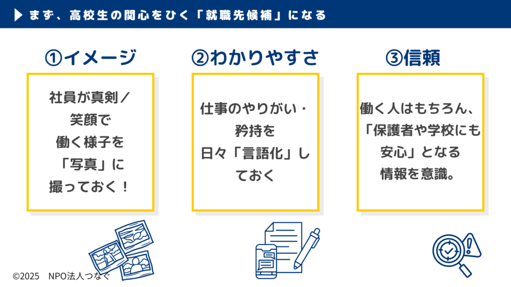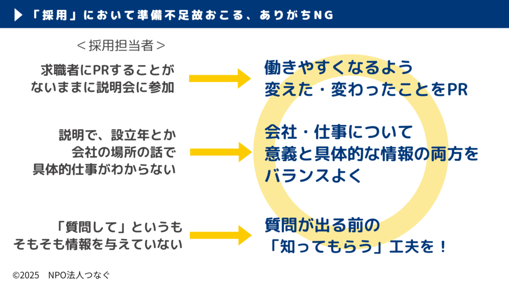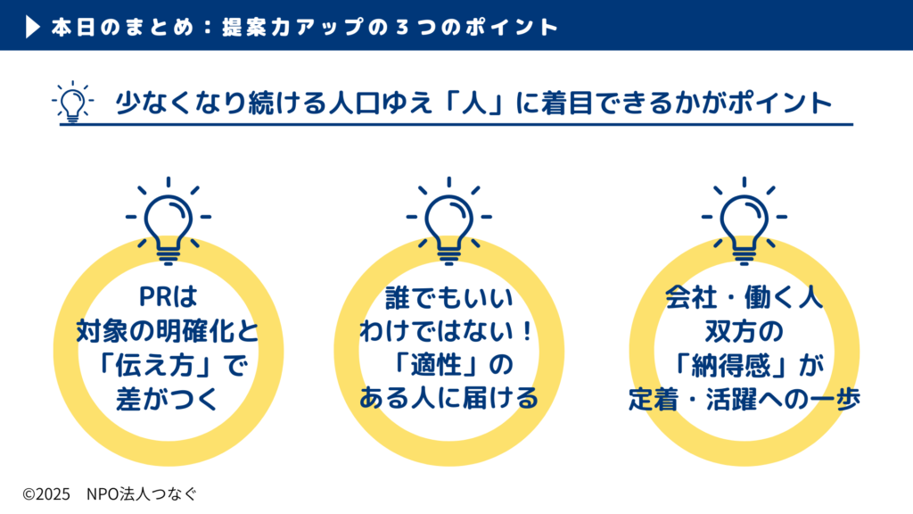 ご参加いただく企業や個人の方のご意見も伺いながら、当法人は地域の企業の「採用力アップ」/個人の「安心して働ける」環境につながるよう、活動します。