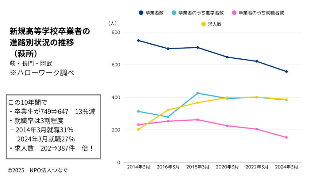 山口県でみると、令和6年3月高等学校卒業者の就職状況で、卒業者数9429人、就職希望2584人(27.4%)、うち就職したのが2572人(99.5%)です。