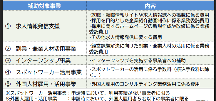 市内の中小企業者等の人材確保とUIJターン希望者・学生等の市内就職促進を図ることを目的とし、中小企業者等が行う採用活動、インターンシップ、生産性の向上及び経営課題の解決を図るための副業人材活用、外国人雇用に係るコンサルティング業務等に要する費用に対し、必要な経費の一部を補助します。(HPより抜粋)
