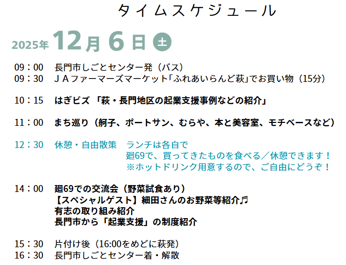 こんにちは!長門市しごとセンターでは、「自分らしい、やりたいことに挑戦する起業」をもっと身近に・具体的に感じてもらいたくて、起業した人に話を聞きに行くツアー等全4回のイベントを開催しています。