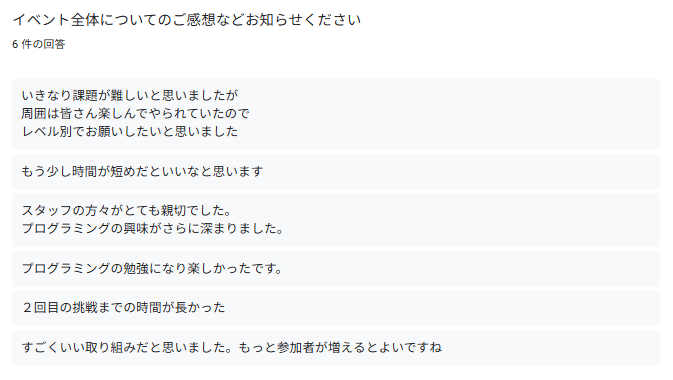 ・13時まで質問OKにしていたけど、ぎりぎりまでOKでよいかも。13時までの時点で質問がなかったのが、「何を質問していいのかわからない」からではないかと感じた