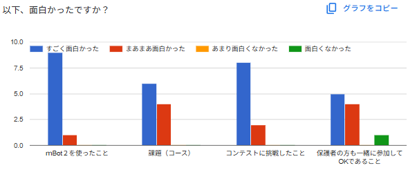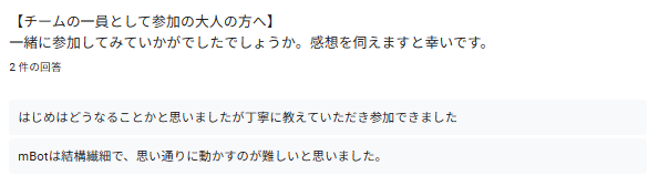 ・チームで1台にプログラミングしてもらったが、興味をもってmBot一人1台使いたそうにしていたので。柔軟に挑戦できる課題にしてもよいかも