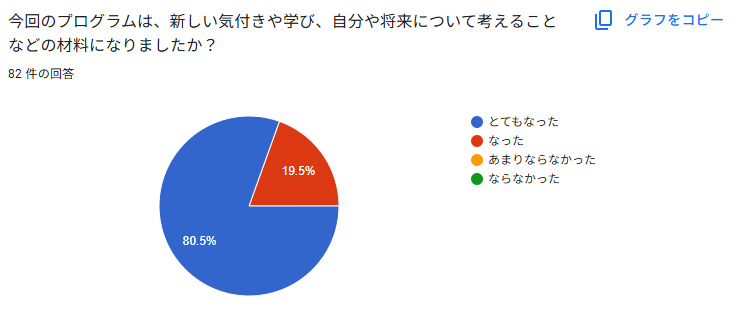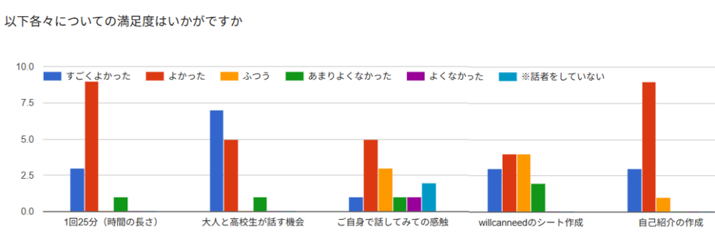 学校内だと関わることがない大人の方々と関わることができて、自分の価値観が広がった。また、学校の先生では教えてくれない将来のことを沢山教えて貰えたから。将来への不安や疑問が少し解消されたと感じるから。