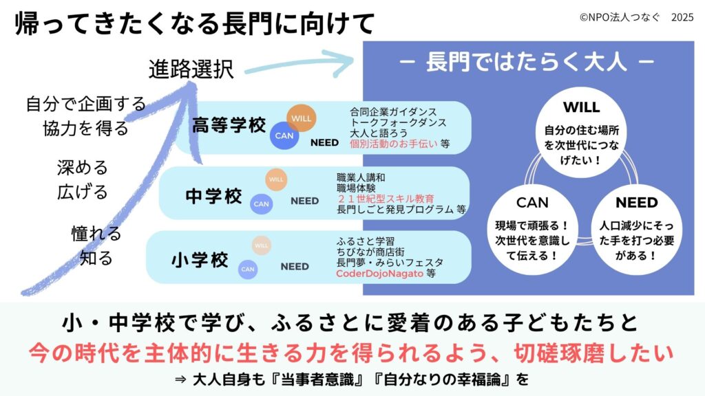 ・ドワンゴ学園とも連携して中学2年生に対して行う「キャリア教育」プログラム(当法人も連携しています)の前半6時間は、地域の強みや課題に出会う時間として「長門しごと発見プログラム」に関連させて一学年時に行い、二年時の職場体験学習につなげる。ドワンゴプログラムの後半は、三学年での総合的な学習「具体的な地域への参画、貢献活動」へ誘う学習活動として二年時に行うと、長門らしいキャリア教育の流れができるのでは?