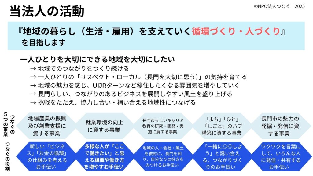 長門市しごとセンター/NPO法人つなぐも、地域の1プレイヤーとしてやったらいいと思うことを1つずつやっていきたいと思います。