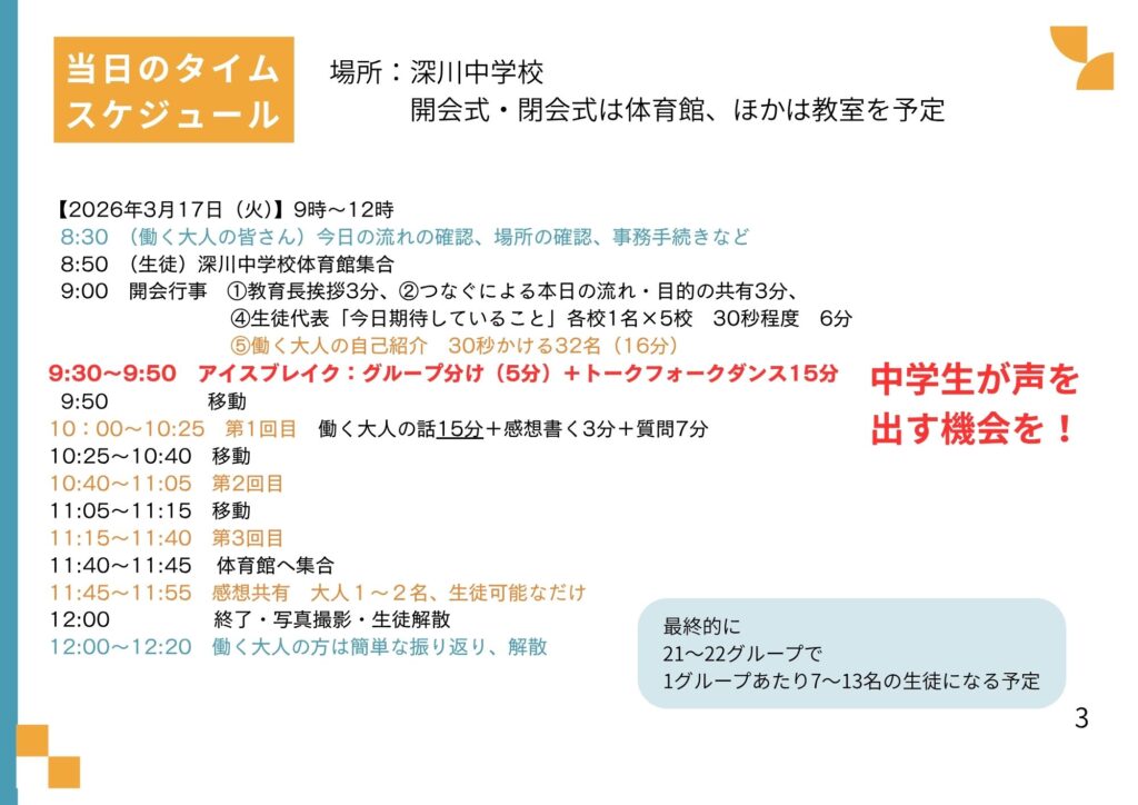おっしゃる通り『自己紹介』については、大人の方々に協力いただいて早めに作らせてもらい生徒・学校に共有していました。これがあったので、当日の自己紹介はいらないという考え方もできるのかもしれません。