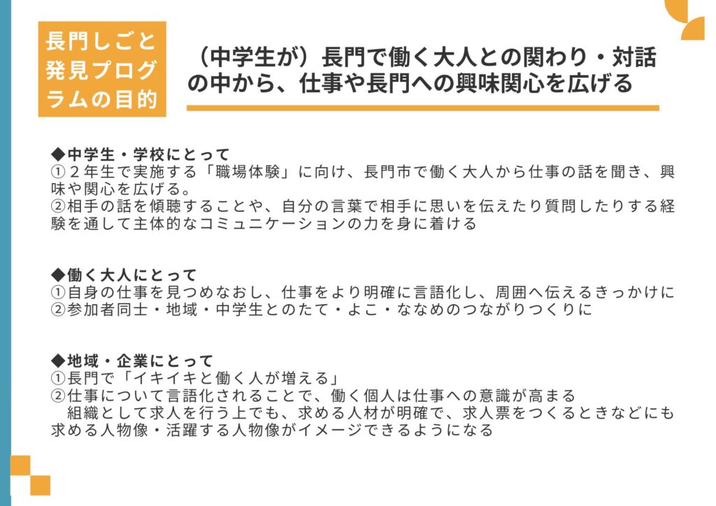 生徒たちが『地域で働く大人』と出会い、その生き方に触れることで、自分の将来を自分なりに充実させ、長門を大切に思う気持ち(シビックプライド)を育てる機会をつくりたい