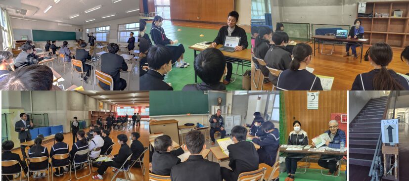 見ている限り小走りで教室を移動し、黙って座っているまじめな生徒が多かったです。大人の方々も、日ごろは中学生と接しない方の方が多いので緊張気味に迎え入れて。時間が来るのを待たずに話が始まる様子もありました。