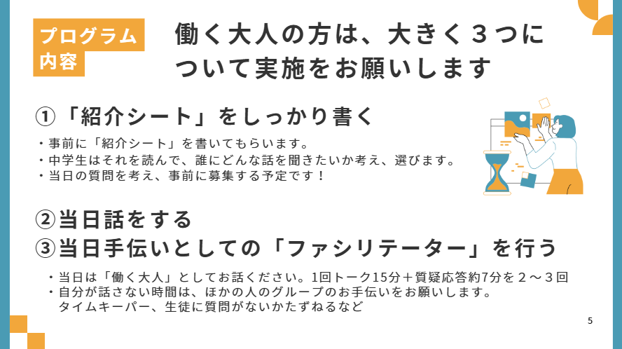 (事前に大人に自己紹介シートを作ってもらい、開催2週間前に共有、学校でも指導いただき御覧いただけるようにしていました)