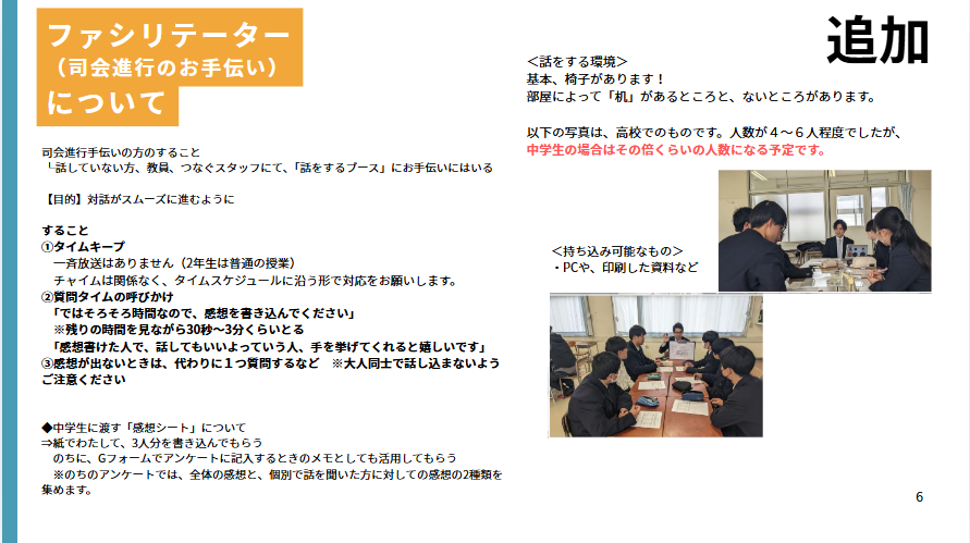 なお、ファシリテーターとして何をしていいかわからない感じの方が半分くらいいらっしゃったものの、半分くらいの方々は話者の話を聞いて、生徒への声掛けなどもされていらっしゃいました。2回目があった際に、改めて丁寧に説明をしていきたいと思います。