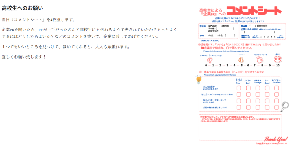 高校生には、企業ごとに「コメントシート」を書いてもらっているので、それは企業に共有させていただきます!