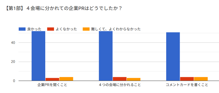 | 企業PRは参加しませんでしたが、多くの方にPRできるので良い企画だと思います。 第1部がなく、2部のブース回数が増えるのもよいと思います。 |