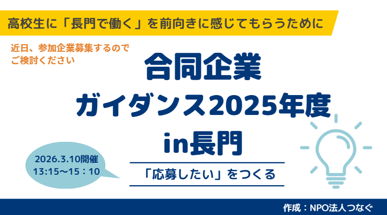 こんにちは!NPO法人つなぐ事務局です。 長門でイキイキと働く人を増やすことを目的に、2018年より「企業の担当者と直接話せる機会」である合同企業ガイダンスin長門を開催しており、今年度は2026年3月10日(火)に開催 […]